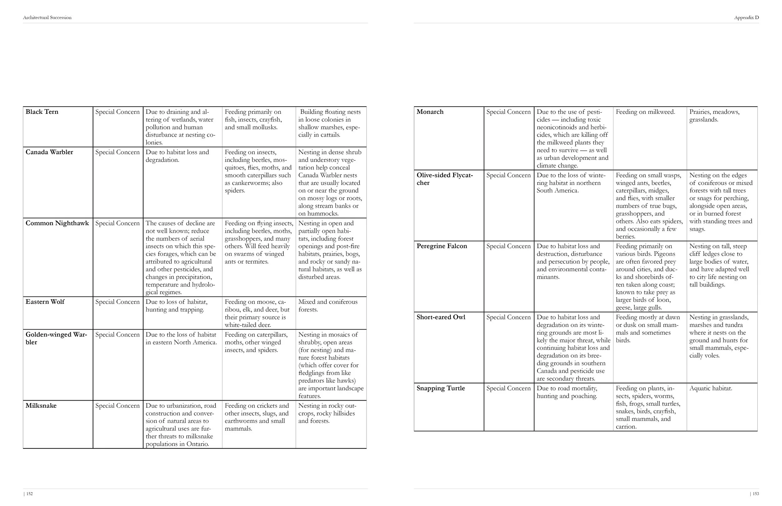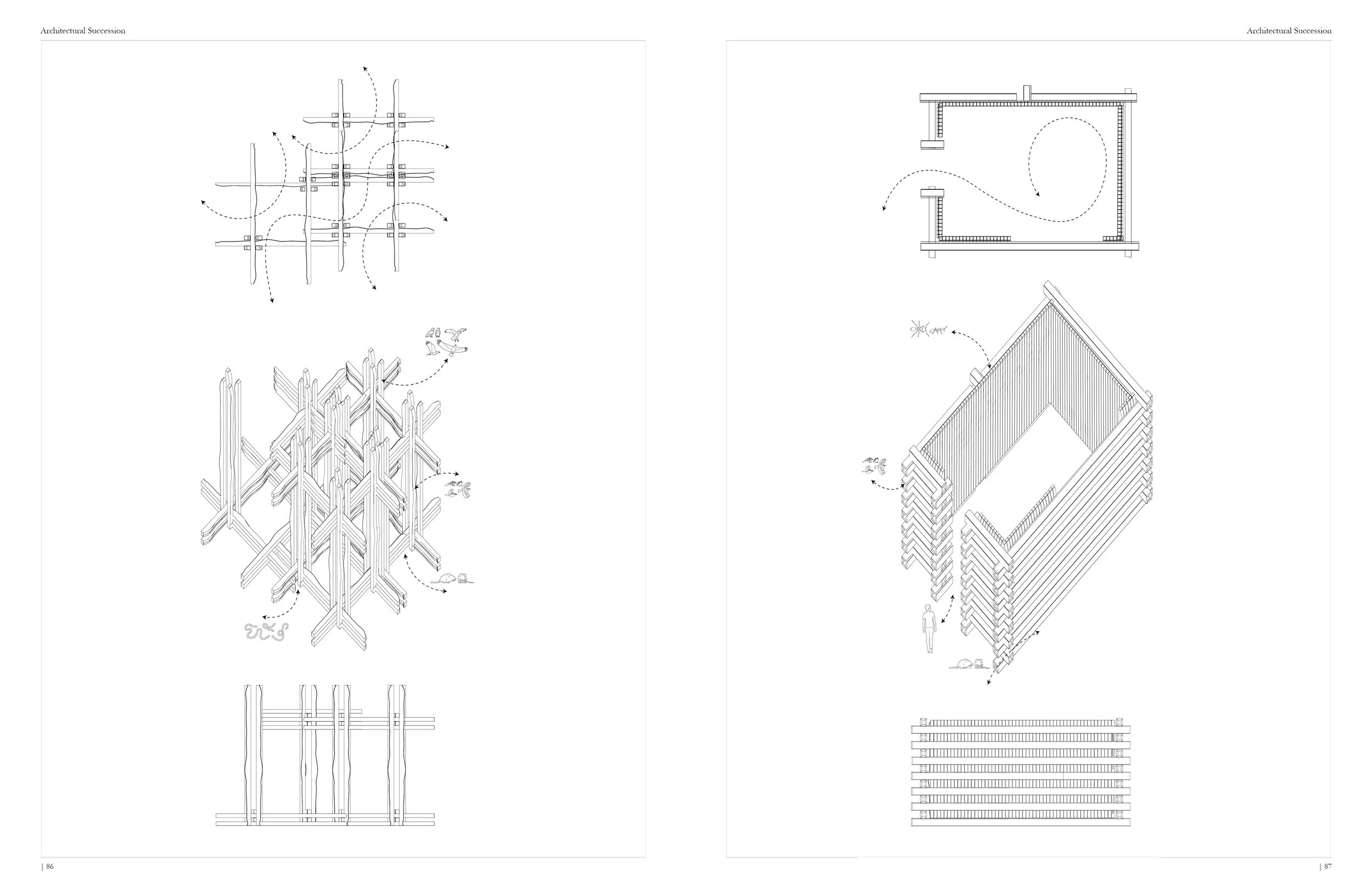 Abstract: A novel approach to single-species design is urgently required. Urban expansion is directly impacting global biodiversity, increasing habitat-threatened species reliance on human infrastructure. Whereby recognizing the architect’s responsibility to provide habitat for additional species, the built environment can be utilized for multi-species inhabitation. Derived from the natural cycle of ecological succession, Architectural Succession outlines the process of change occurring for a built environments program and user over time. Informed by this framework, a Research Creation process examines the at-risk Chimney Swift and its food source within a successional multi-species structure. Further enhancing Sudbury, Ontario’s, Regreening efforts, barren outcroppings offer significant opportunity for multi-species built intervention, encouraging habitat recovery and the return of species at-risk. A wildlife observation pavilion explores the successional opportunities of traditional light wood frame construction undergoing the decomposition process to support the regrowth of the forest.