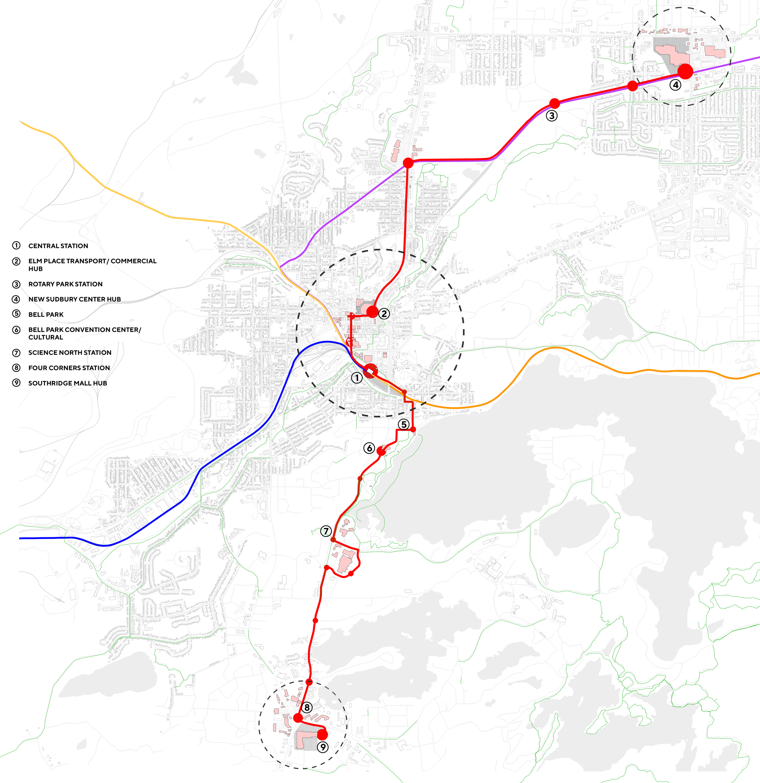 Greater Sudbury is often defined by the vast area encompassed by the city limits. As a result of this urban sprawl, its various constellation towns and neighborhoods are inevitably disconnected, and automobiles are a necessity for transportation throughout the city. Not only is this dependence harmful to the environment, but it creates transportation limitations that prevent many people from experiencing all that Sudbury has to offer. In 2050, this disconnect can be remedied.
